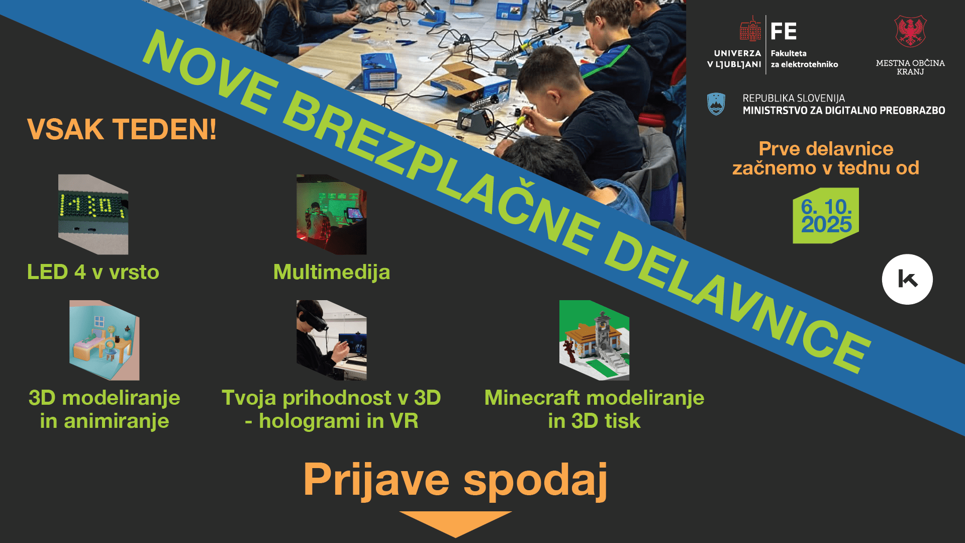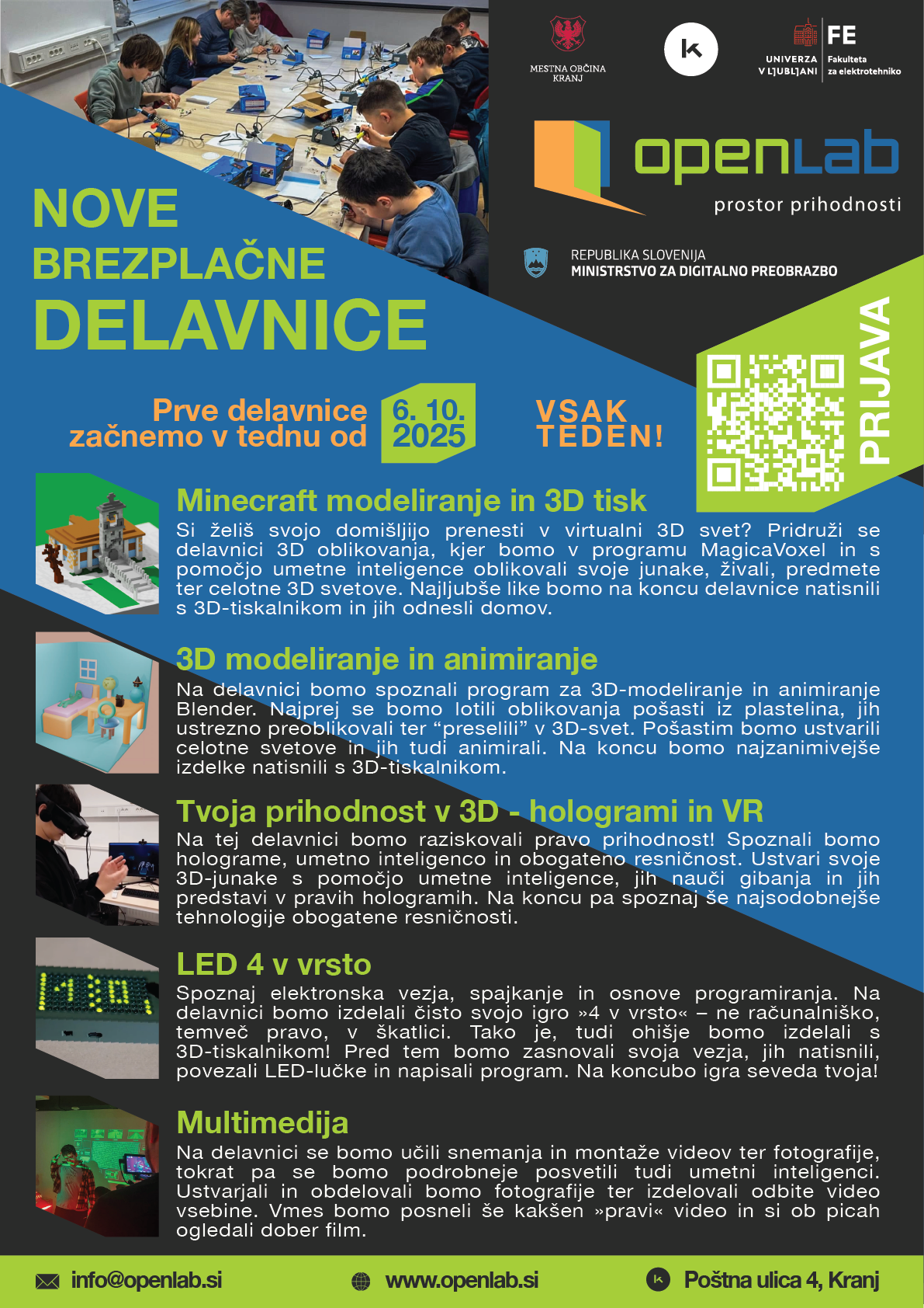 Klub OpenLab iz Kranja za mlade odpira novo sezono brezplačnih tehnoloških delavnic, ki se pričnejo naslednji teden. Delavnic bo pet in bodo pokrivale različe tehnološke tematike. Še se lahko prijavite, več informacij najdete na spodnjem letaku in tukaj.