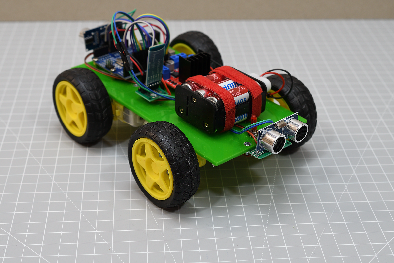 Skoraj vsi novi avtomobili imajo serijsko vgrajene senzorje ovir (parkirne senzorje), ki delujejo večinoma na podlagi ultrazvoka. Za nadgradnjo našega eksperimentalnega vozila z ultrazvočnim sistemom za zaznavanje ovir potrebujemo dva majhna cenena ultrazvočna modul (HC-SR04, cena okoli 2 EUR), ki ju preprosto namestimo na sprednji in zadnji konec vozila. HC-SR04 poleg ultrazvočnega oddajnika in sprejemnika vsebuje tudi dovršeno elektronsko vezje, ki poskrbi za merjenje razdalje in za povezavo s procesorsko enoto Arduino Uno.