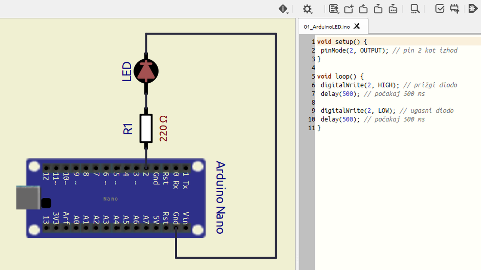 V prejšnjih dveh številkah Tima smo objavili članka, ki obravnavata načrtovanje projektov iz elektronike. V nasprotju s serijo Prvi koraki v Arduino izpred petih let smo se letos osredotočili na prikaz uporabnosti simulacijskega orodja SimulIDE, ki omogoča ponazoritev delovanja elektronskih vezij, vključno s programirljivimi krmilniki, kakršni so tudi tisti s platforme Arduino. V tem Timu so predstavljeni preprost primer vezja z utripanjem LED-diode ter vezji za leteče luči (angl. running light) in alarm. Projekti so načrtovani z orodji umetne inteligence (UI), programske kode pa so objavljene TUKAJ.