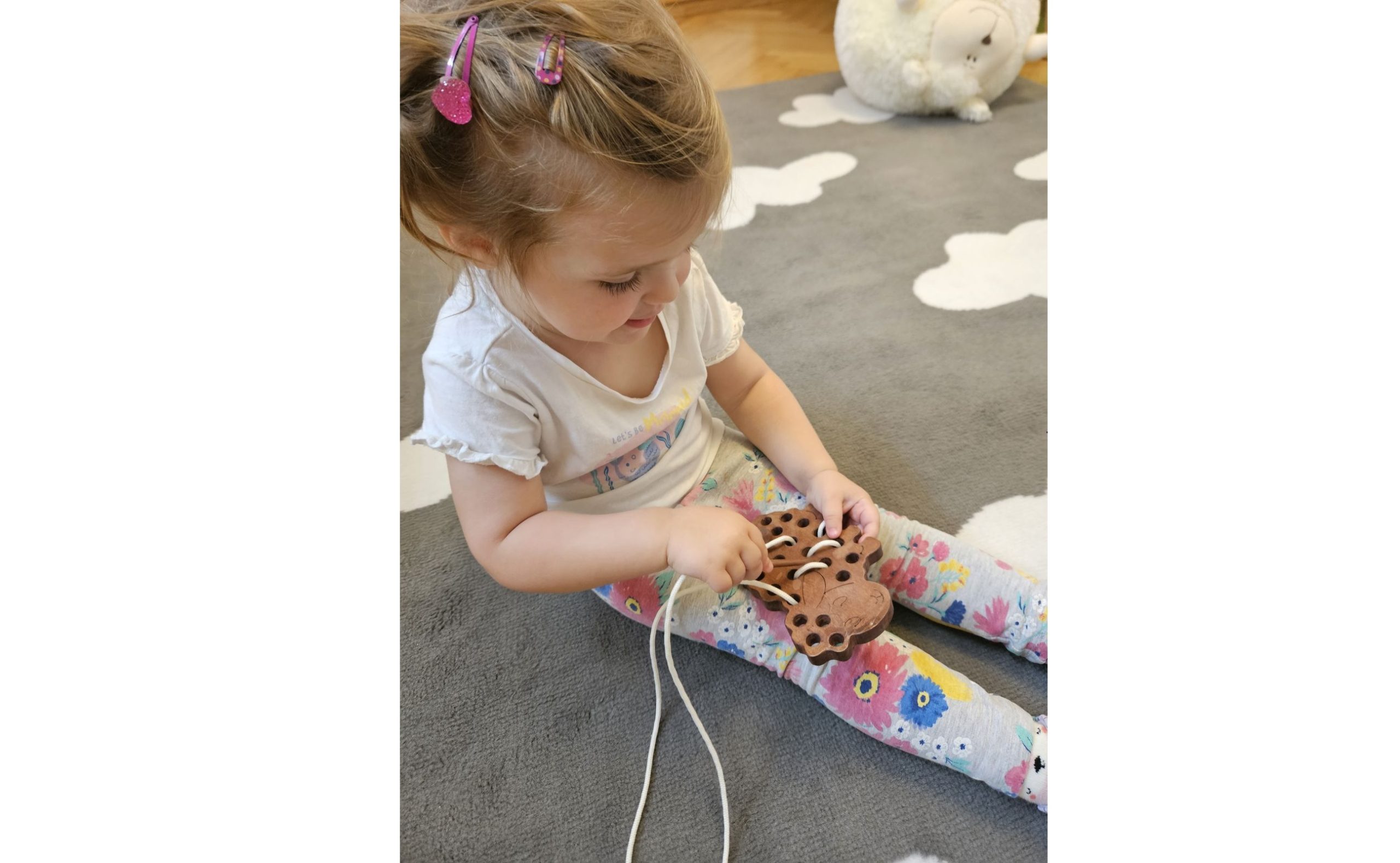 Montessorijeva prepletanka v obliki ovčke je lep primer, kako preprosta ideja lahko postane močno didaktično orodje. Narejena je iz gladko obdelanega in z naravnim premazom zaščitenega masivnega lesa. Če takšno igračo izdelamo sami, ji dodamo osebno vrednost in otroku pokažemo, da lahko ustvarjamo tudi s svojimi rokami. Po robu in v notranjosti lika so enakomerno razporejene luknjice, skozi katere otrok vodi vrvico. Mlajši to počnejo po navdihu in brez kakega posebnega sistema oziroma pravila, starejši pa že lahko sledijo zaporedju in oblikujejo vzorce, kar omogoča postopno učenje in raziskovanje.